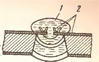 Рис. 1. Схема удаления оксидной пленки 1-капля припоя; 2-оксидная пленка |