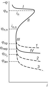 Рис. 2. Анодная поляризационная кривая 1—область активного растворения металла; 2—активно-пассивное состояние металла; 3—пассивное состояние металла; 4—нарушение пассивного состояния металла; |