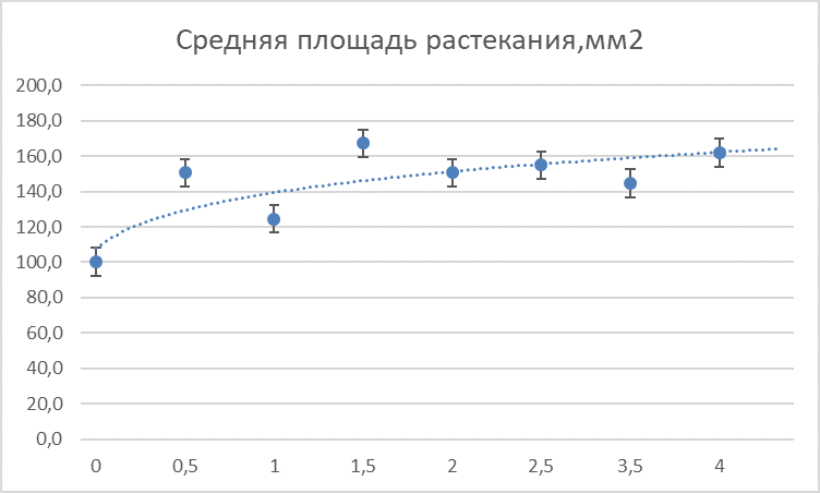 В результате работы были получены составы флюсов, имеющие высокие технологические свойства. Эти флюсы позволяют обеспечить большую площадь и высокую равномерность растекания припоя. Были получены паяные образцы из сплава АД31, прочность паяного шва которых была выше прочности основного металла. Проведена оценка влияния компонентов флюса на технологические свойства флюса. В результате было обнаружено что наибольшее влияние на свойства флюса оказывает фторид калия (KF). По достижении определенного содержания он практически перестает влиять на свойства флюса. (Рис. 3)
